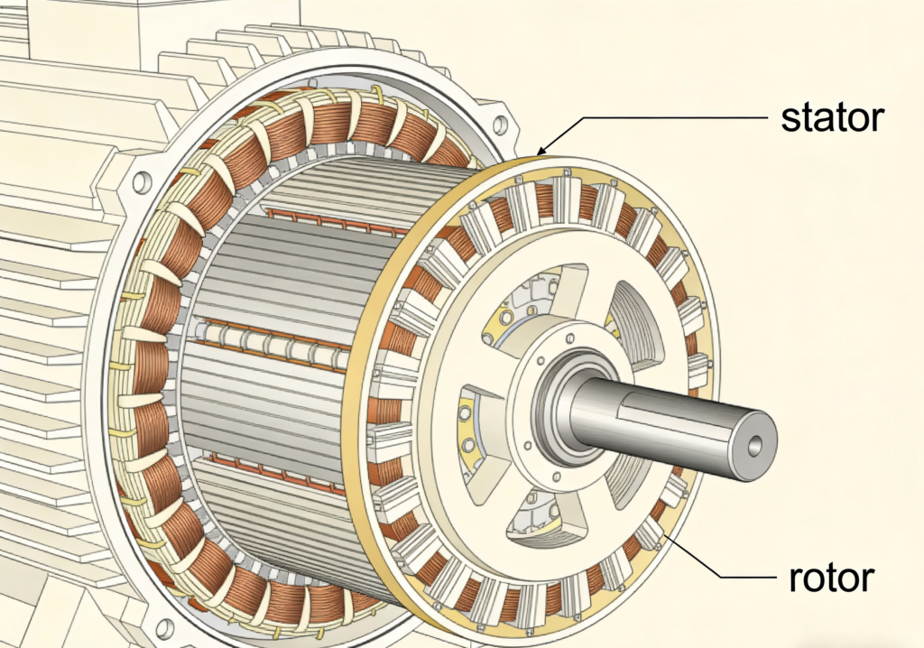 The torque generated by a motor comes from the electromagnetic interaction between the stator magnetic field and the rotor magnetic field.